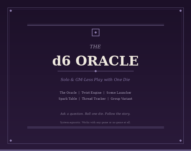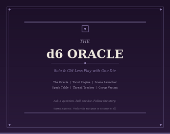 The d6 Oracle is a solo and GM-less play tool that fits in your pocket and runs any game. Ask a yes-or-no question, roll a d6, and the Oracle answers — with complications, twists, and escalations that keep the story moving forward even when you don't know what happens next.